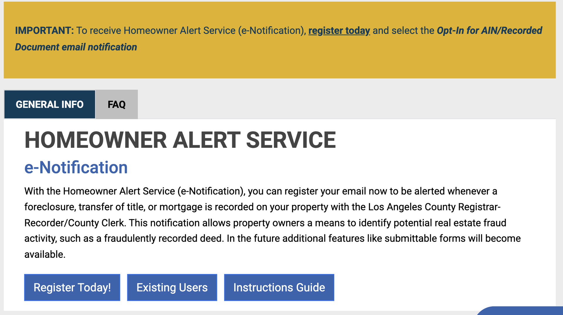 Homeowner Alert Service (e-Notification) is a free Los Angeles County program that emails property owners within 48 hours whenever a document is recorded on their property (such as a deed, notice of default, or notice of sale). It complements—does not replace—the County’s existing mailed paper notices.
